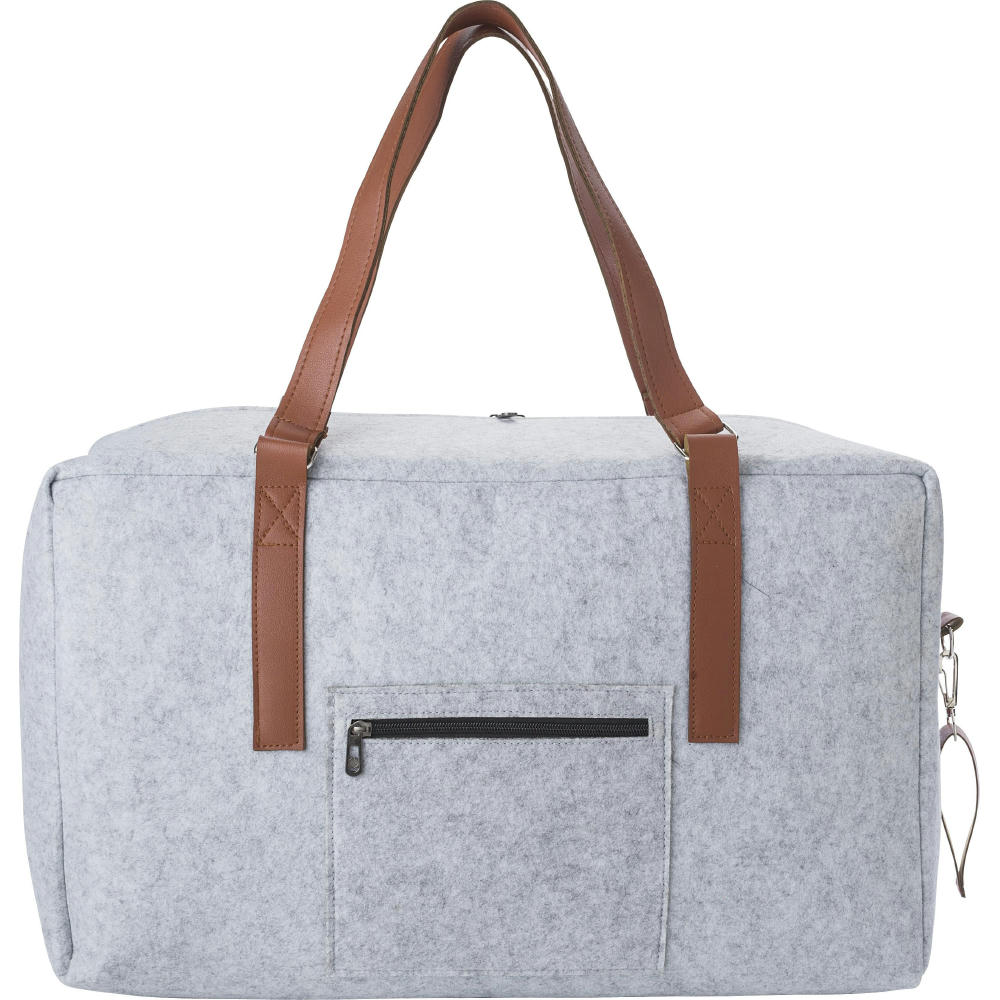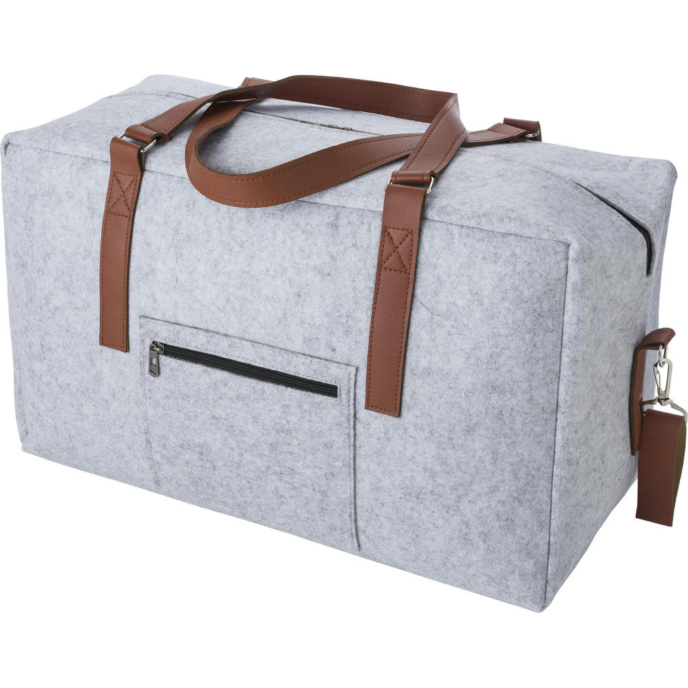 rPET-Filz-Reisetasche mit PU-Details und Trageriemen. Ein großes Fach mit Reißverschluss, kleines Fach ohne Reißverschluss.