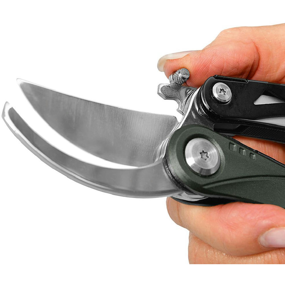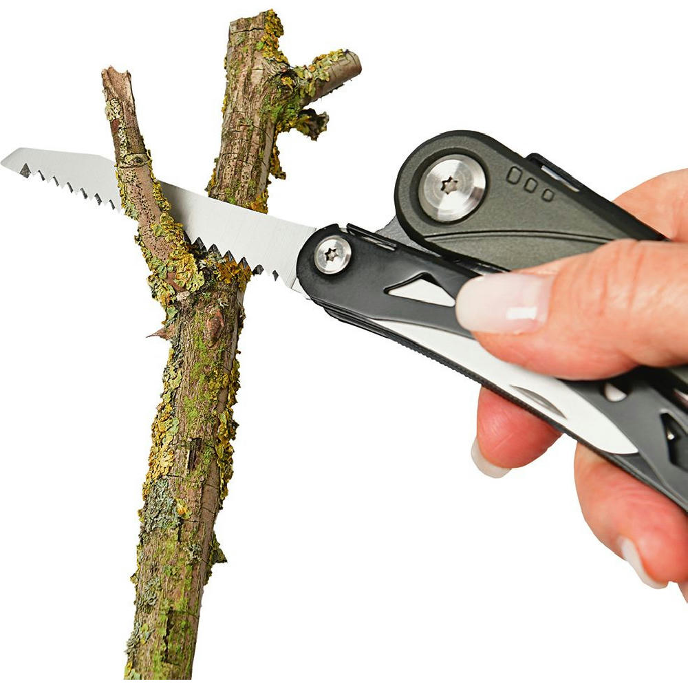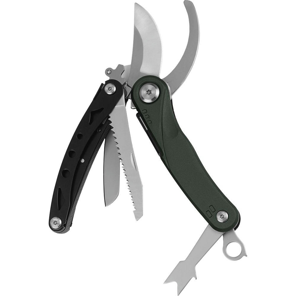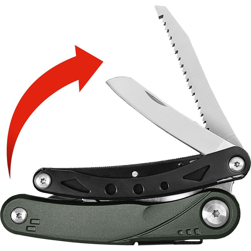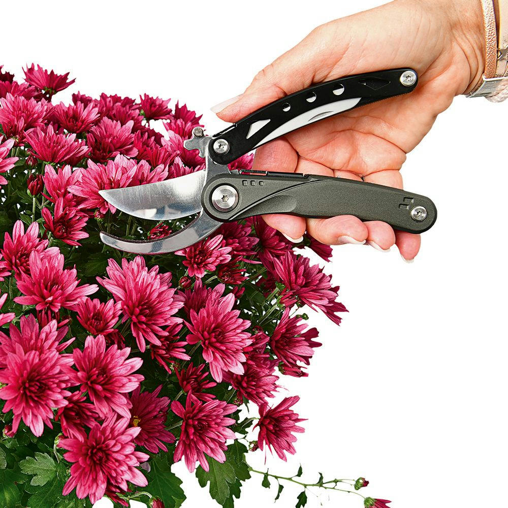 Multifunktions-Gartenschere mit 5 Funktionen: Gartenschere, Messer (Klingenlänge 70 mm), Holzsäge, Wurzelzieher.