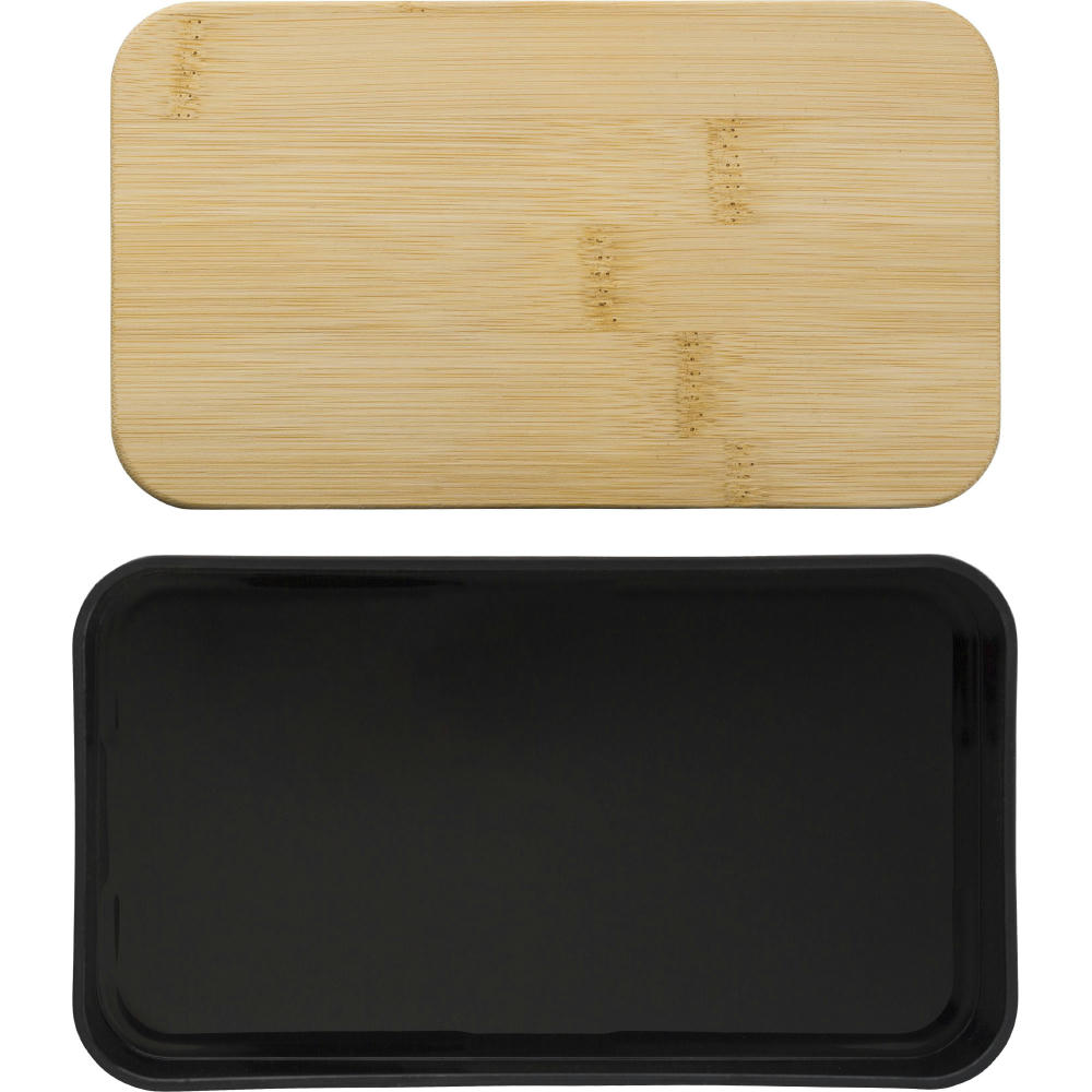 Doppellagige PP-Lunchbox mit mehreren Fächern (2 x 400 ml) und Bambusdeckel. Inklusive Trennwand und Plastikbesteck (Löffel, Gabel und Messer) und Gummiband.