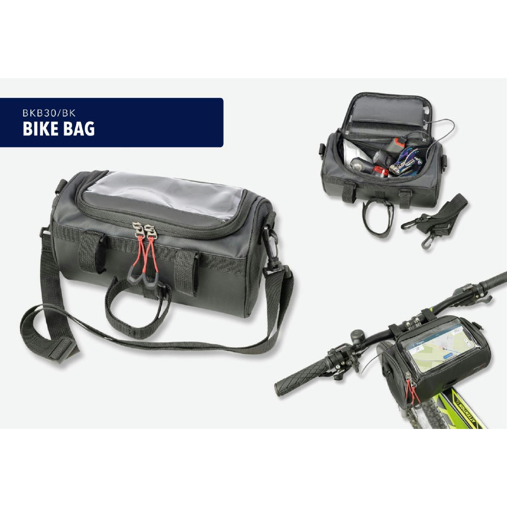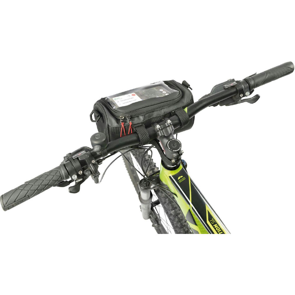 Fahrradtasche für den Lenker, flexible Befestigung mittels 3 Klettverschlussbändern am Lenker, geräumiges Hauptfach mit Reißverschluss, inkl. Netzfach (z.B.: für Powerbank), Touchscreen-Sichtfenster passend für gängige mobile Geräte zur Navigation, seitlich geöffnet zum Hauptfach (Laden via Powerbank), abnehmbarer, verstellbarer Schultergurt, Schlaufe zur Befestigung des Vorderlichts, Kapazität ca. 4 Liter, Tragkraft bis zu 5 kg, schützt Inhalt vor Spritzwasser (Wasserdichtheitsgrad IPX4) , formstabil durch verstärkte Kanten.