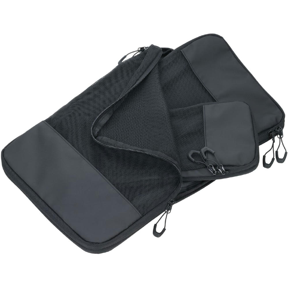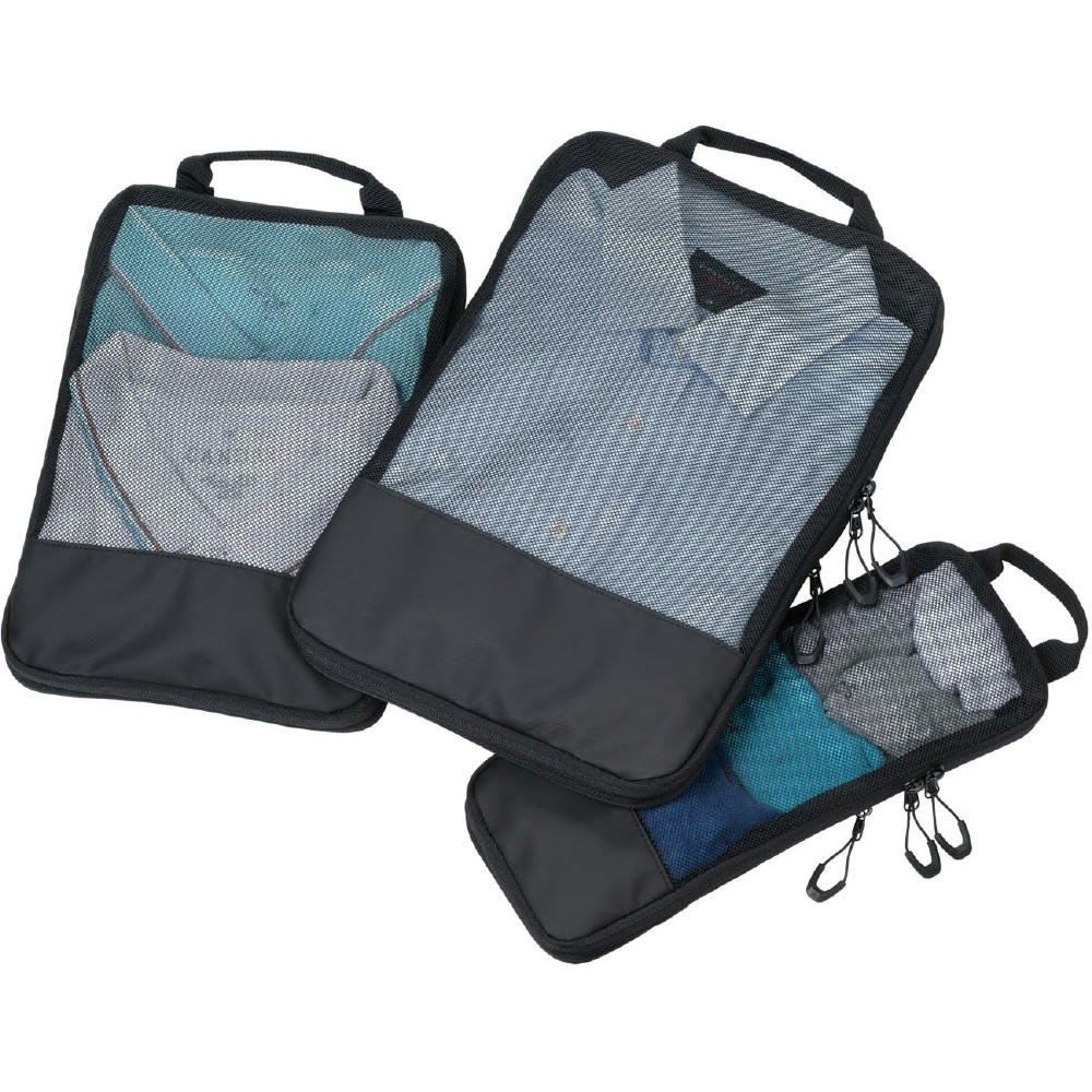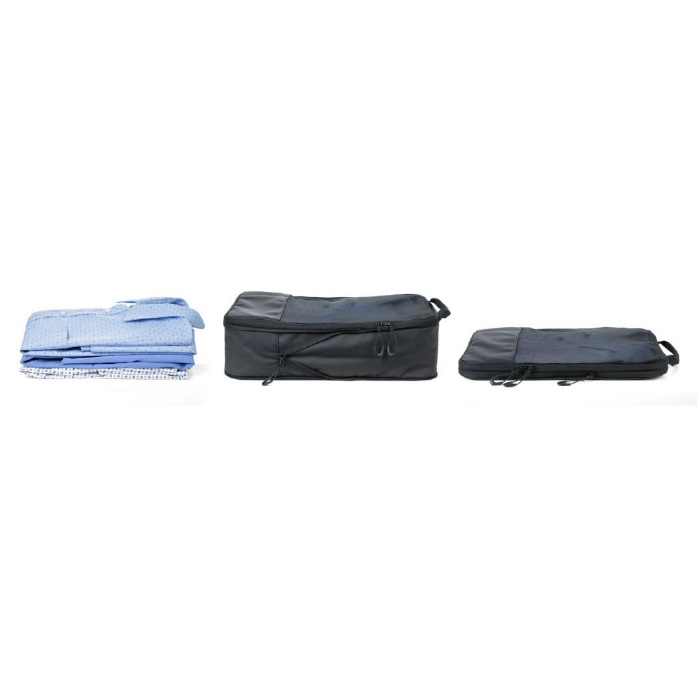 Dreiteilig für verschiedene Kleidungsstücke: Größe L für Hemden & Hosen, Größe M für Shirts und Größe S für Socken und Wäsche – platzsparend, geordnet und knitterfrei. Durch verschließen des Netzfach-Reißverschlusses wird der Inhalt vollständig komprimiert.