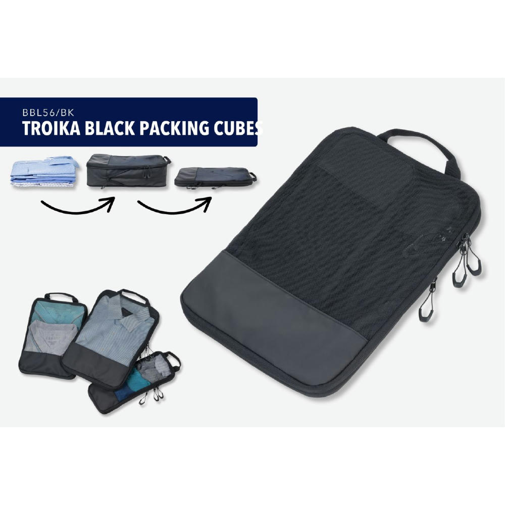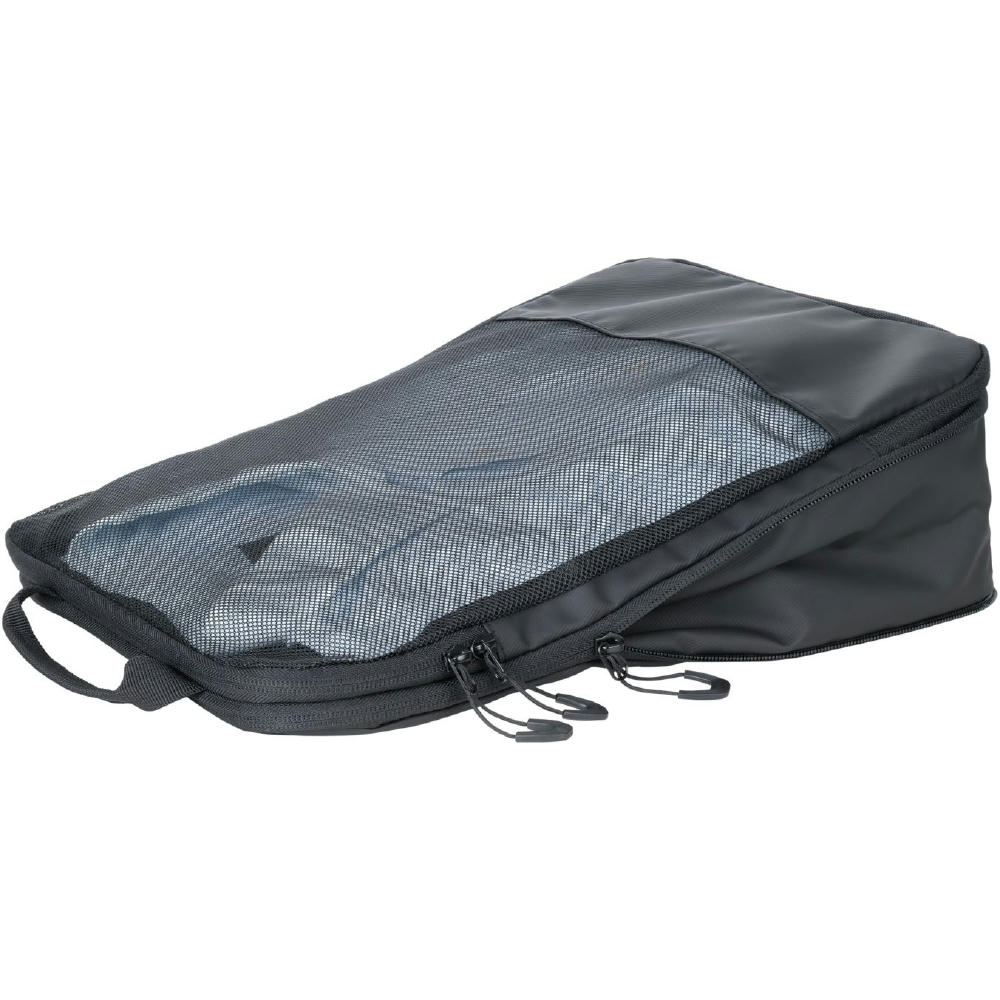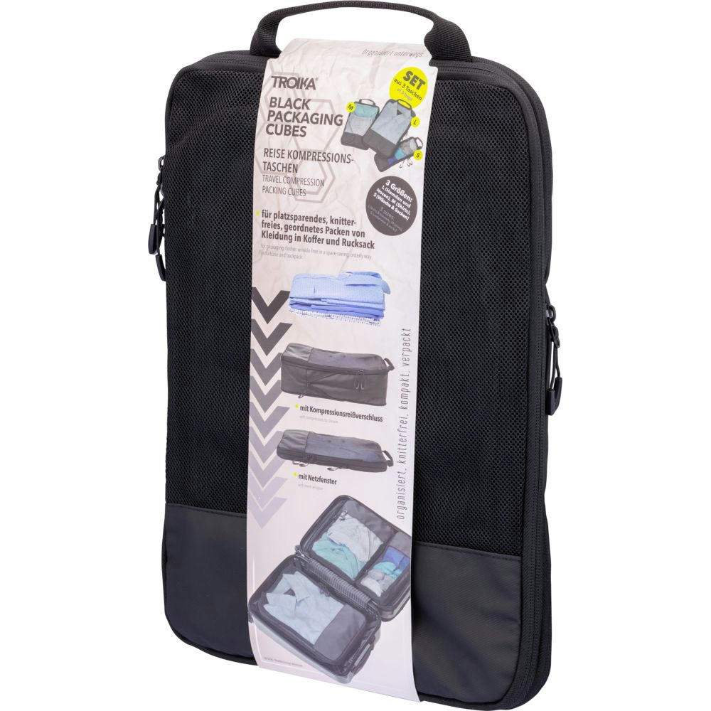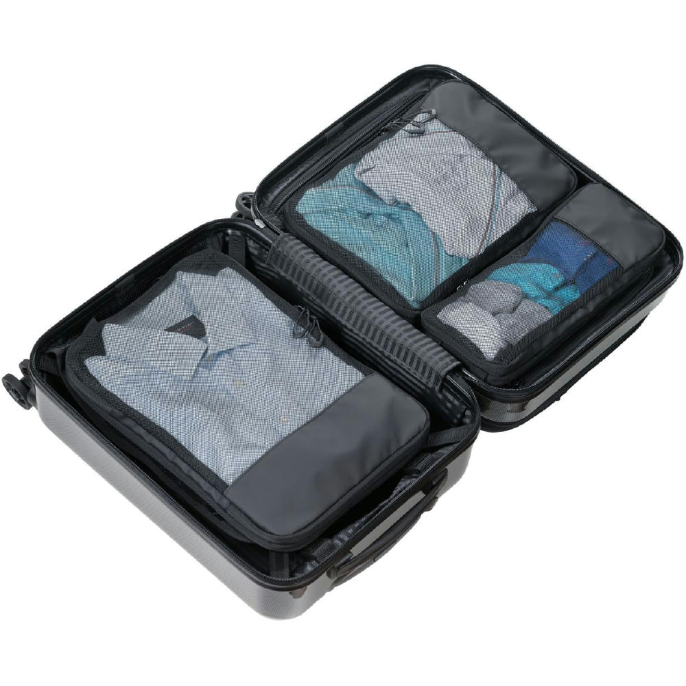 Dreiteilig für verschiedene Kleidungsstücke: Größe L für Hemden & Hosen, Größe M für Shirts und Größe S für Socken und Wäsche – platzsparend, geordnet und knitterfrei. Durch verschließen des Netzfach-Reißverschlusses wird der Inhalt vollständig komprimiert.