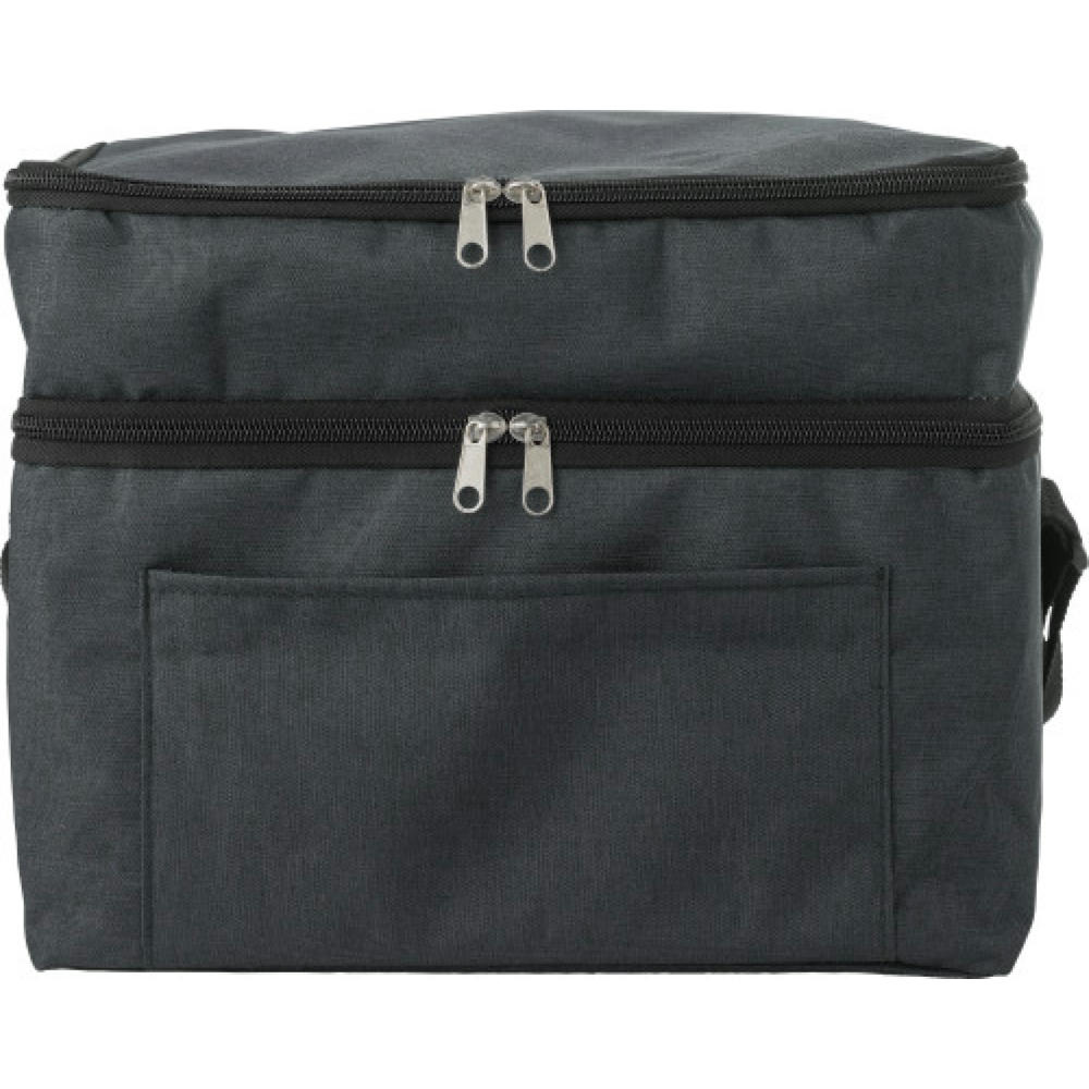 rPET-Kühltasche mit Aluminiumfolie innen. Zwei Fächer mit Reißverschluss. Inklusive Tragegurt.